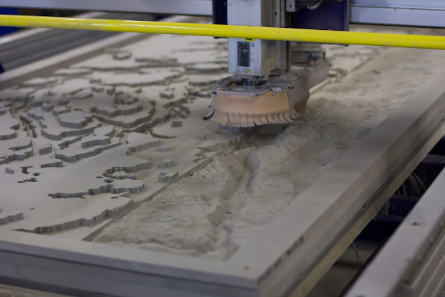 Together with Jon Olav Eikenes and Christan Løverås, I'm part of a new startup called Norviz . The main focus so far has been on projecting animated graphics onto physical landscape models. Our first job was to tell the history of the Telemark Canal , a beautiful waterway connecting the sea and the interior through eight locks at a distance of 105 km from Skien to Dalen in Norway. The installation was made for West Telemark museum , and is now on show in Vrangfoss , the largest lock complex on the canal with five locks and a lift of 23 metres. The 3D model displays a 10 minutes map animation showing the history of the canal together with historical images, voice and sound effects. Here are some of the technical details which might interest my readers :-) The digital elevation model was prepared in Blender and cutted with a a CNC router . It took the machine about 30 hours to finish the whole model. Cutting a large 240x110 cm model of the Telemark Canal in ...